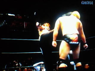 火野の間合いに入ったら、定番の物凄い音の水平チョップで反撃をする…